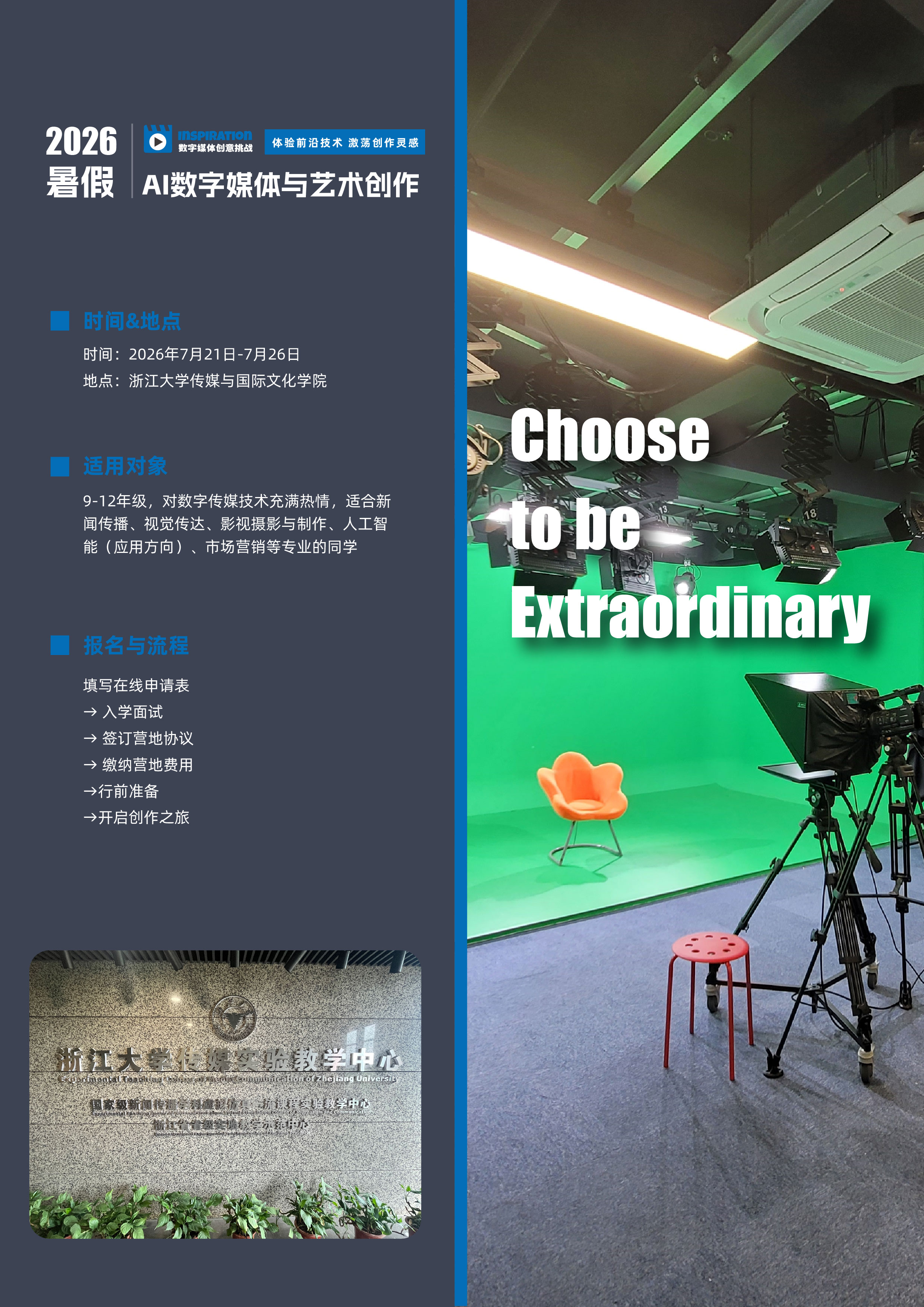 9-12年级,对数字传媒技术充满热情,适合 新闻传播、视觉传达、 影视摄影与制作、 人工智能(应用方向)、市场营销等专业的学生